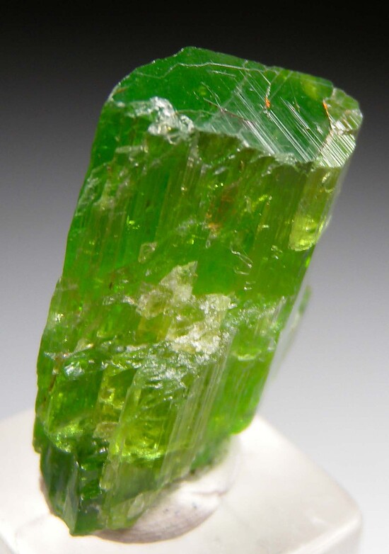 Terminated single Tremolite crystal with bright, vivid green coloration. Transparent, complete all around, with a flat, glassy termination. Most are mere shards or fragments and complete terminated crystals such as this are are much less common. Like a number of other mineral species from Merelani, these Tremolites are considered the world's best of species.