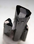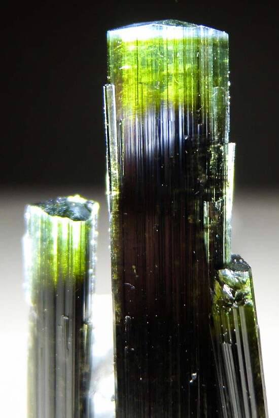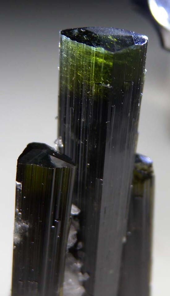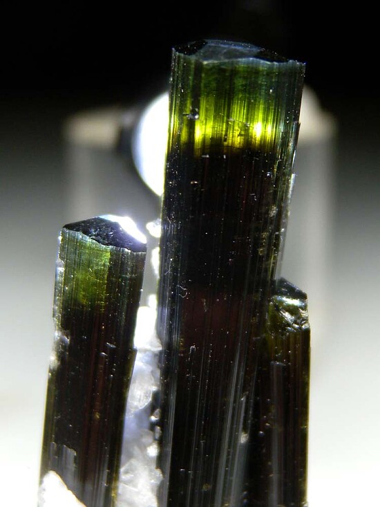 Elegant and sculpturanl cluster of three Tourmaline crystals with attached white Feldspar. The crystals are a gemmy green at the terminations and I love how the crystals lean in towards each other as approach the terminations.