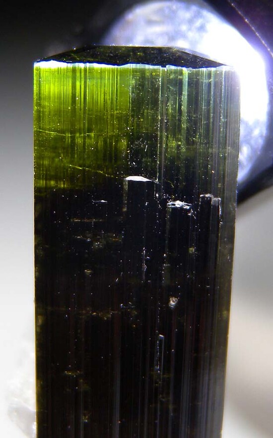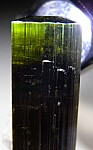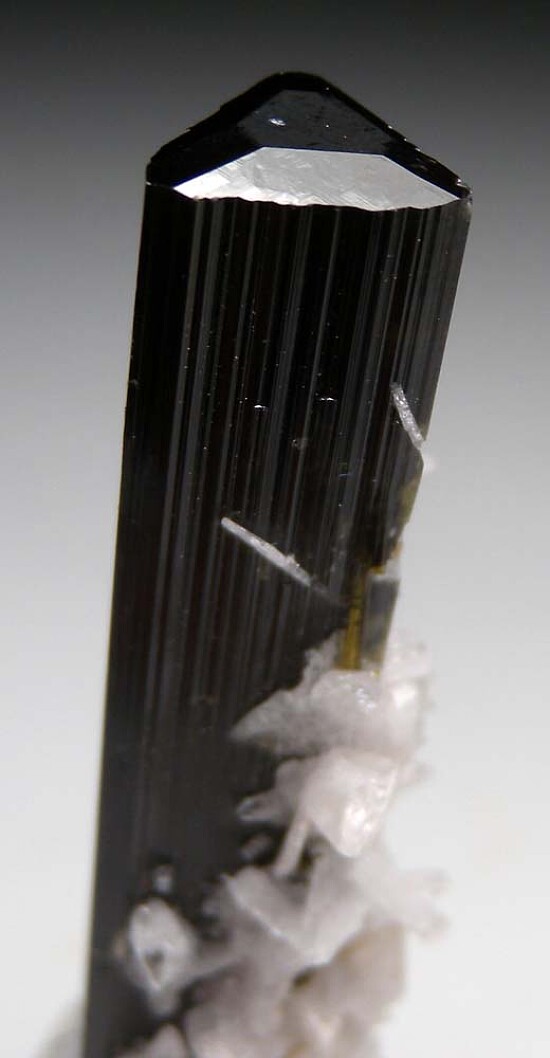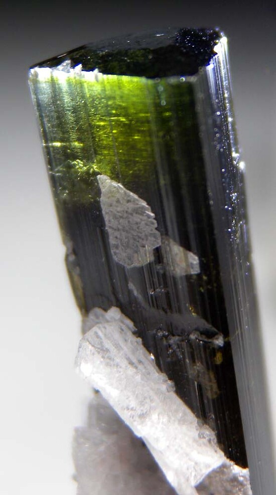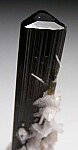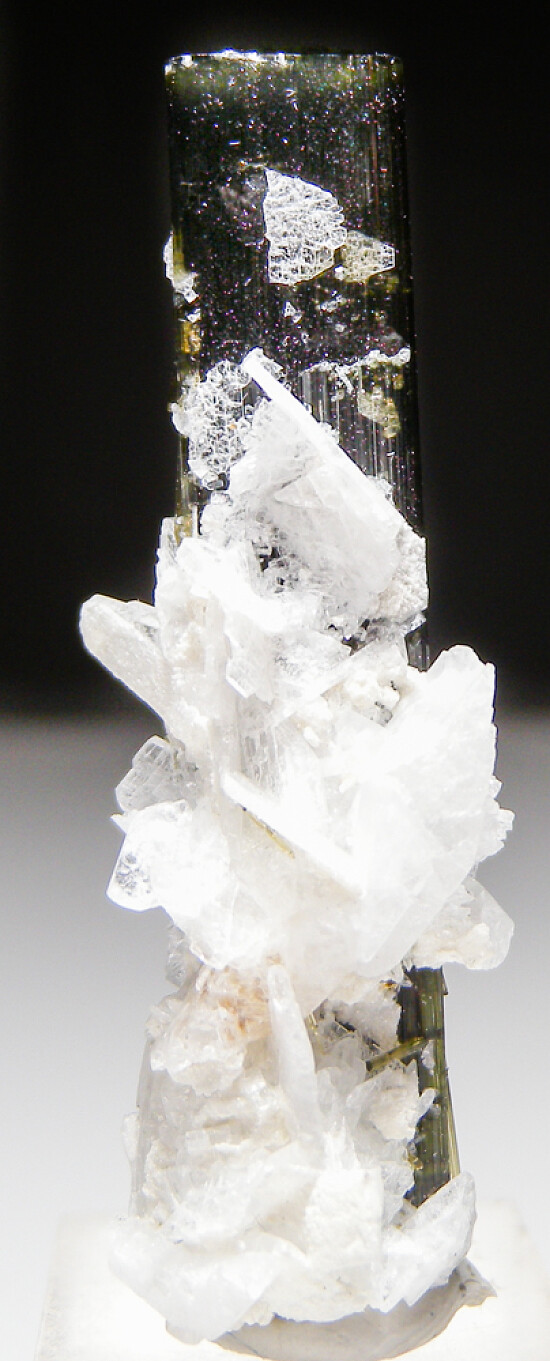 Single well terminated Tourmaline crystal partially enveloped in white Feldspar crystals. The crystal is a gemmy green at the termination and in perfect condition.