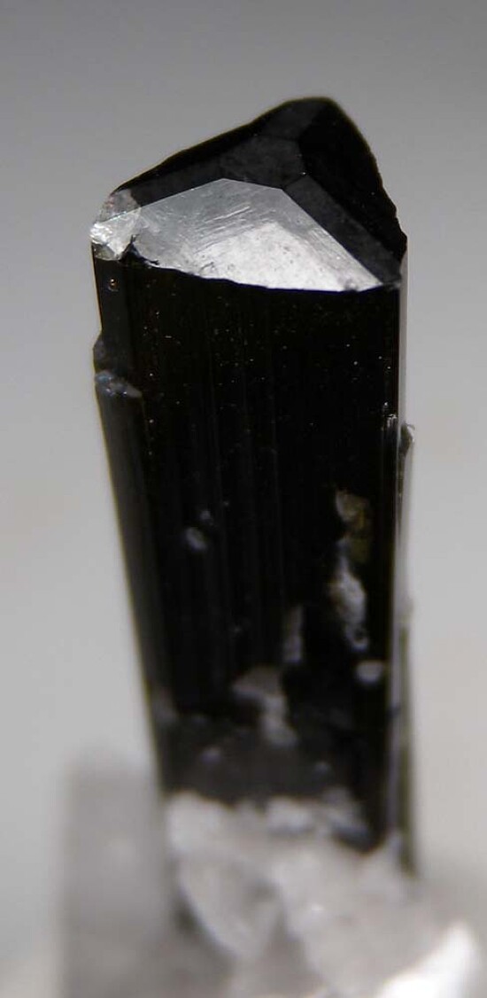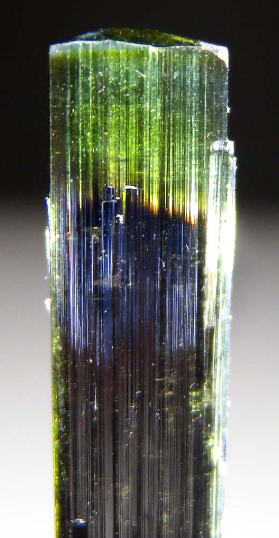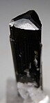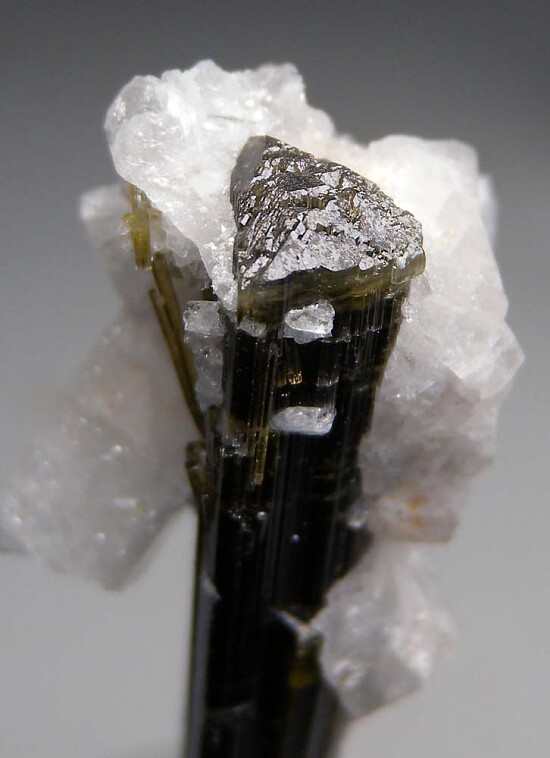 Perfect doubly-terminated Tourmaline crystal with attached Albite crystals. Transparent green with bevelled termination faces at one end. The other termination is transparent and colorless (Achroite). Both robust and platy Albite crystals and smaller terminated Tourmaline crystals add tot he overall beauty of the specimen. Undamaged specimen valued at $250.