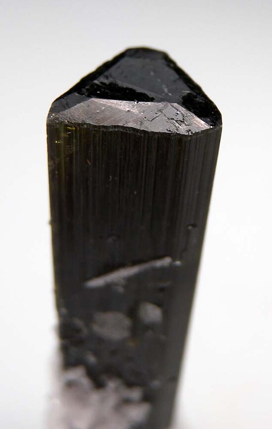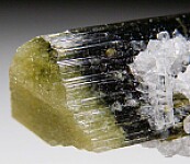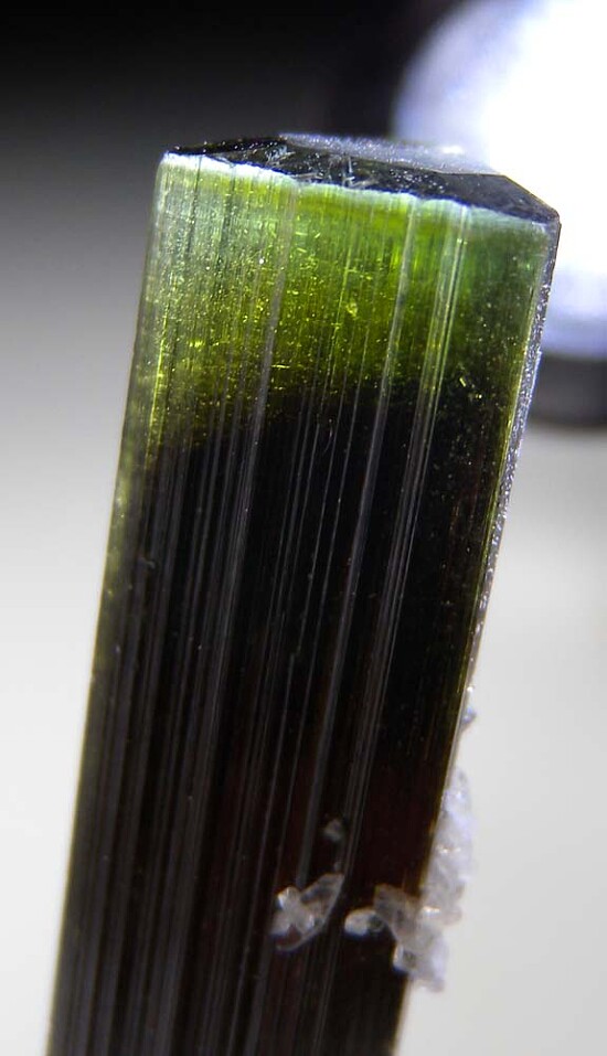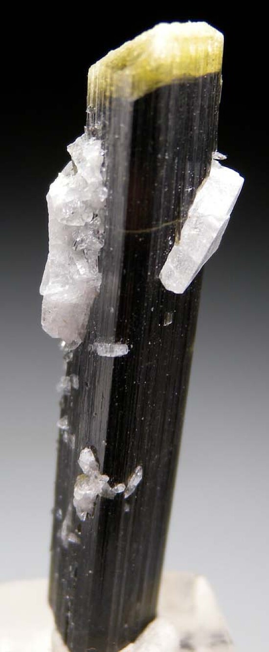 Fine doubly-terminated Tourmaline 'pencil' with attached Albite. Complete all around and undamaged Tourmaline with a translucent yellow terminatiion at one end and a transparent green termination at the other. Really nice!