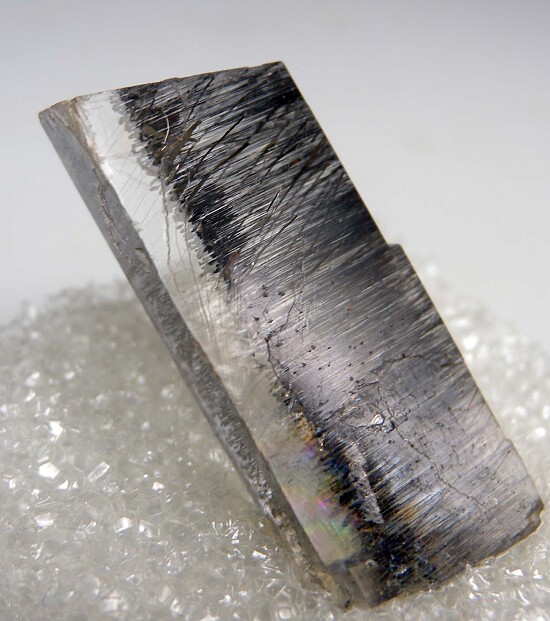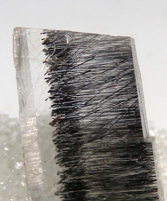 Transparent rhomb of Calcite filled with oriented, needle-like Marcasite crystals.