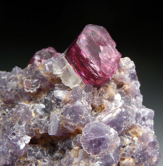 A 5.5cm pink Tourmaline crystal in purple Lepidolite from the Stewart Mine. The Tourmaline has light etching along the side and an irregular termination (it appears undamaged as there are no glassy fracture faces).