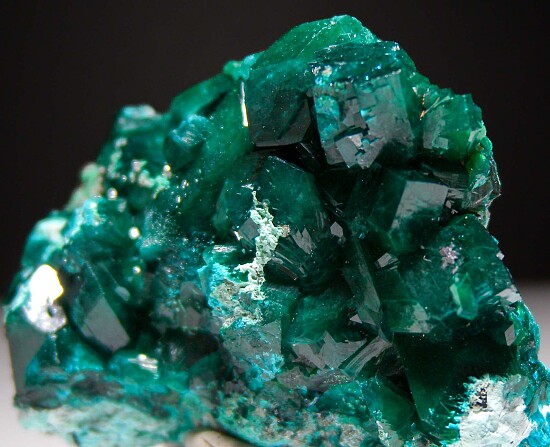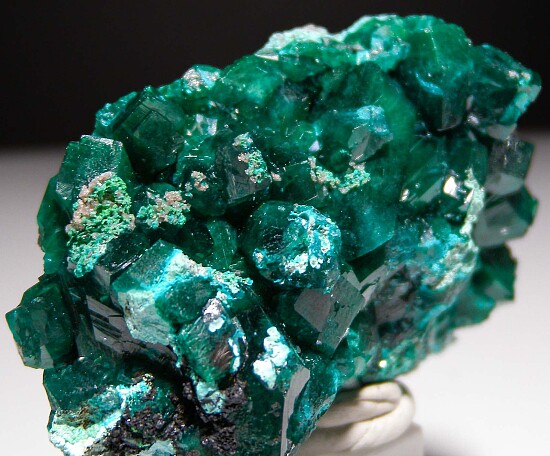 Good sized, relatively flat specimen loaded with large, thick Dioptase crystals atop Chrysocolla. The Dioptase crystals reach 1.8cm in size!! Great example of the fabulous Dioptase currently being found in the Rep. of Congo.