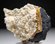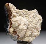Spherical mounds of white Wavellite covering a druse of Quartz crystals. The locality is an old Gold Mine and specimen collecting there started with the discovery of the world's best Fluellite in one area of the mine. Small vugs containing Wavellite, Variscite, and Fluellite were found in a hard, grey rock matrix. This specimen appears to be all Wavellite, but some micro Fluellite could also be present.