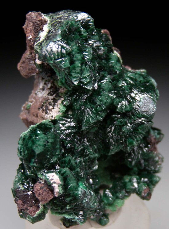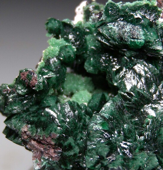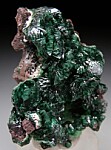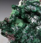 Deep green fan-shaped crystal groups of Zincolivenite from a recent find at the Milpillas Mine. There were a few styles found, one of which were toothy clusters like these, reminiscent of Tsumeb. There is also an unidentified light green mineral present.