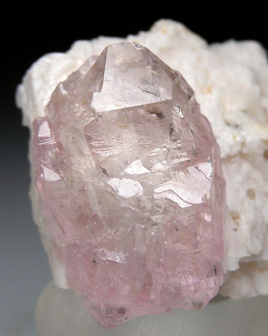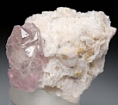 Glassy, lustrous Rose Quartz crystal on Feldspar. The crystal is 3cm tall, well formed (exceptionally crystallized for Rose Quartz) and transparent. The Feldspar is etched and creates an attractive, contrasting matrix. An old specimen from Frank Melanson about 25 years ago.