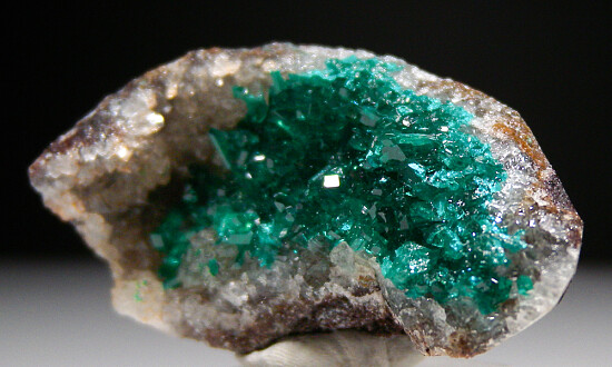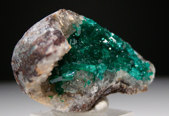 Bright and sparkley specimen of a Quartz crystal lined vug covered by sharp green Dioptase crystals. A beautiful and colorful specimen from recent finds that ahve been producing some excellent Dioptase specimens. This is a nice vug full of crystals, much better than photos. Valued at $150.