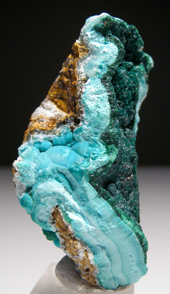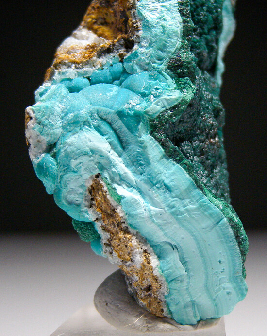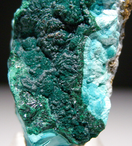 A layer of dark green Rosasite over thick layers of light blue Aurichalcite. Rounded, botryoidal Aurichalcite can be seen in areas that are not covered by the Rosasite. These are neat new combo pieces only ocasionally seen.