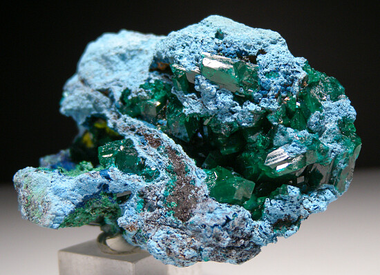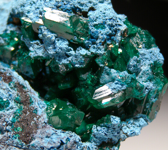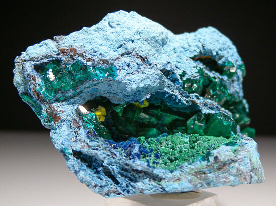 Vugs in solid Plancheite filled with large Dioptase crystals, darker blue Shattuckite, green botryoidal Malachite, and yellow Mimetite. Interesting and colorful!