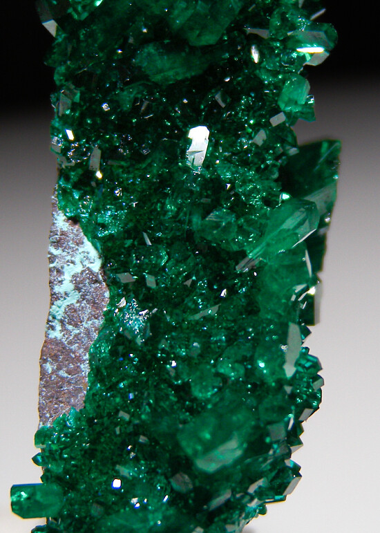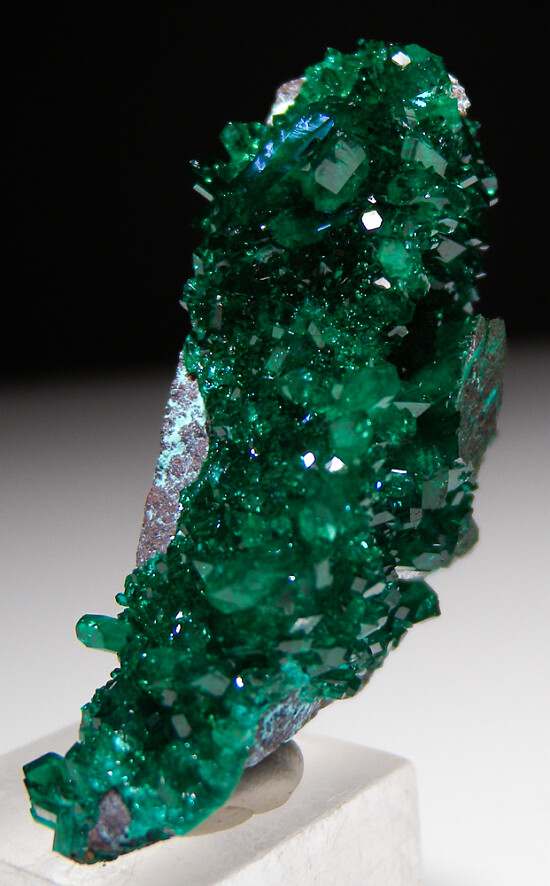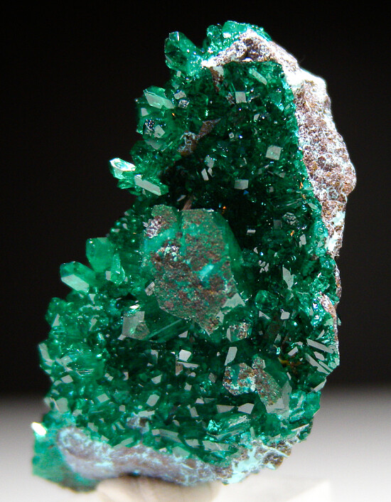 Sparkling Dioptase crystals on matrix from recent finds in the Democratic Republic of Congo. Bright, translucent, and deep emerald green crystals with areas of transparency. In excellent condition with crystals to 1cm in size.