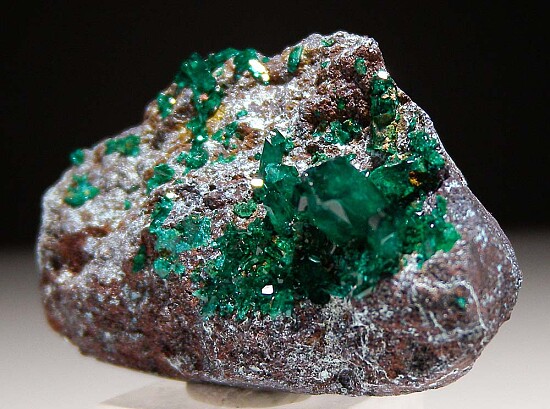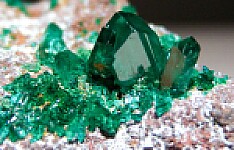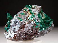 Green Dioptase and light blue Plancheite on matrix fromt he Sanda Mine. Excellent quality Dioptase crystals that are sharp and translucent with areas of transparency. Crystals on both sides of matrix.