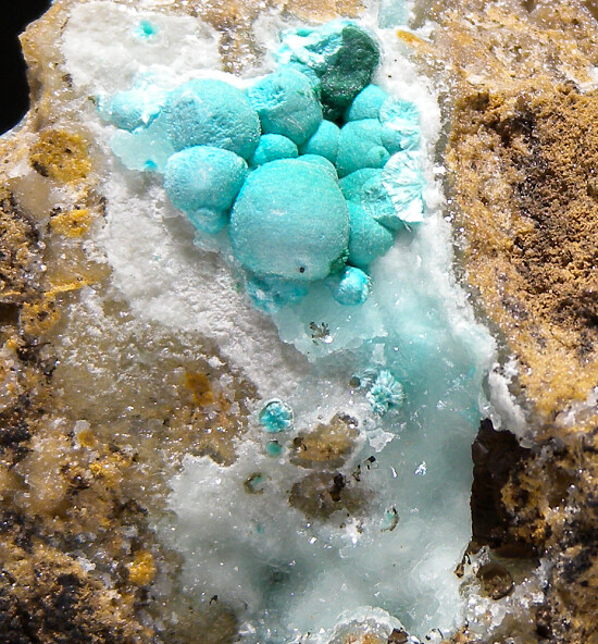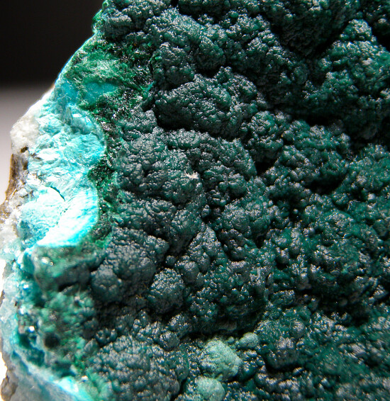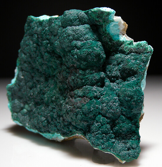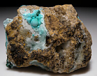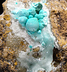 Beautiful deep green Rosasite coating the light blue Aurichalchite from recent finds. Good sized, colorful specimen. Hemispherical Aurichalcite is present on the back side. Valued at $150.