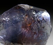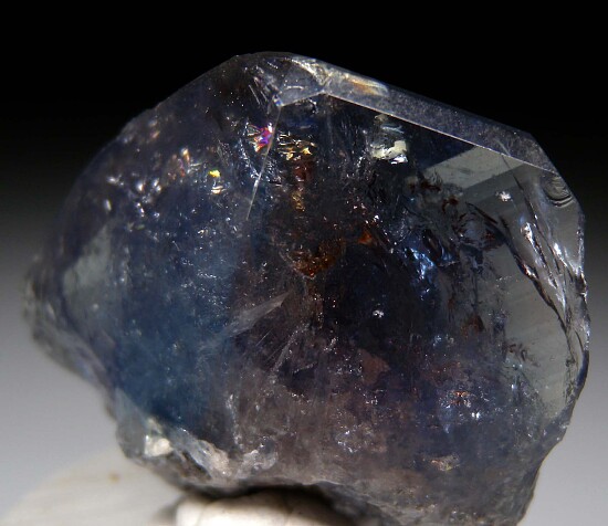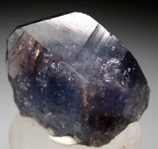 Stunning single crystal of Magnesioaxinite (Axinite-Mg) from Tanzania. These are found as a biproduct of mining for Tanzanite and are only seldom found. This is a good one, with glassy luster, transparency, and nice purple and blue coloration. It's much thicker and robust than most. Complte all around with minor edge chipping, much better than the vast majority.