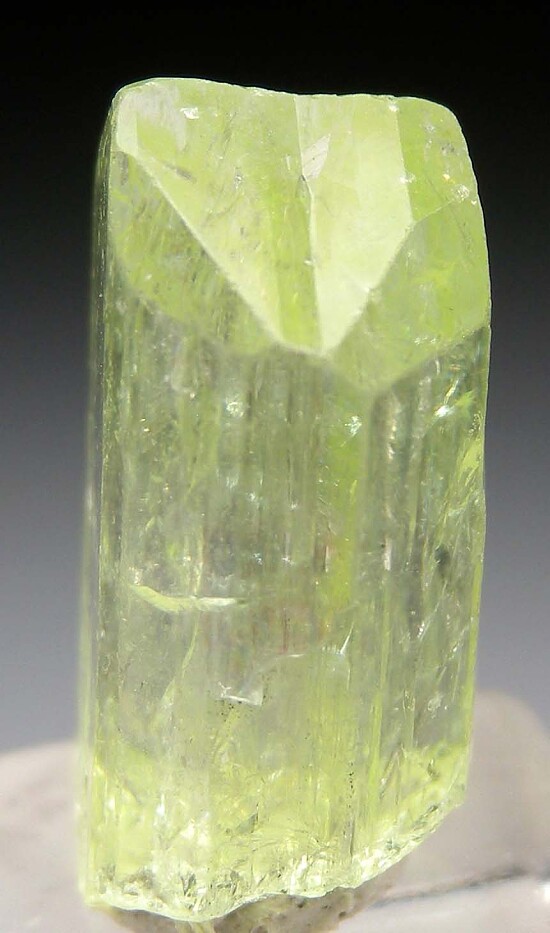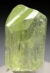 Glassy green Diopside crystal from the Merelani Tanzanite mines. Complete all around and undamaged with a V-formation down the centers of the termination faces caused by twinning.