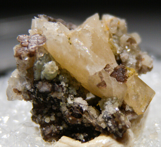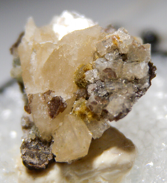 Translucent white Kosnarite crystals associated with mica crystals. Ex. Dan Carlson collection.