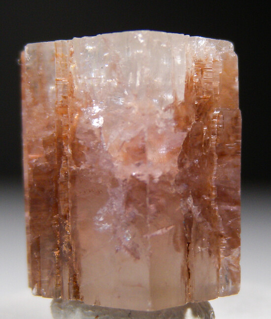 Classic hexagonal, barrel-shaped Aragonite crystal from Spain. Complete all around with areas of transparency. Quality, uniform-shaped thumbnail-sized example from this well known occurrence. While not rare, the sharp uniform hexagonal form and luster make these striking specimens. Similar to the Pyrite crystals from Spain, these Spanish Aragonites always stun due to their textbook form. Ex. Dan Carlson collection.