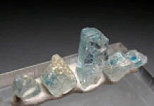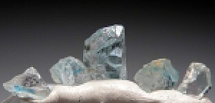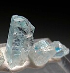 Group of 5 Euclase crystals from Alto Equador, Brazil. The crystals are translucent to transparent, colorless with a characteristic zone of blue that this locality is known for. The crystals have a mixture of cleavage and crystal faces.