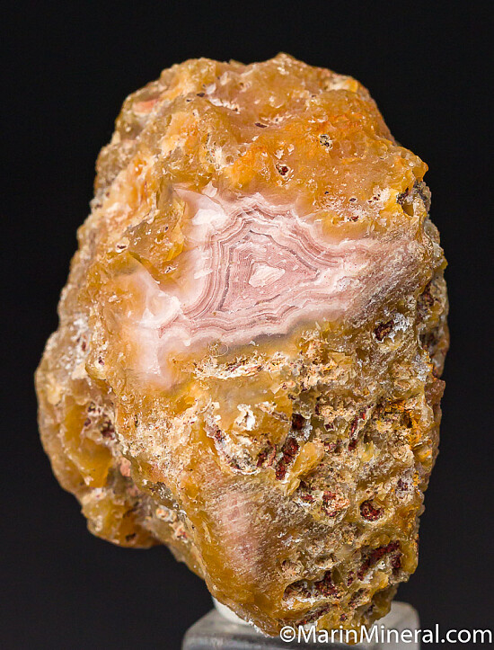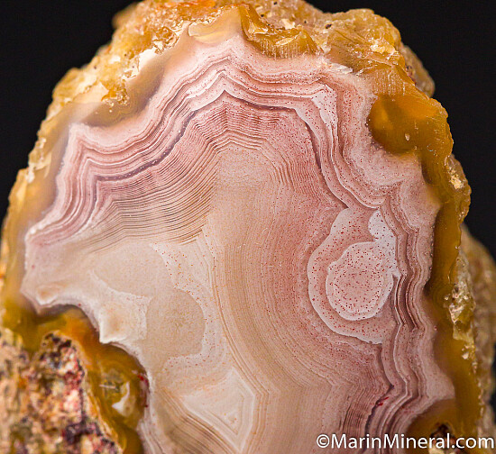 Beautiful Laguna Agate with tight pink and white banding. Polished on one side with a slightly rounded surface. Ex. Chuck Trantham collection.