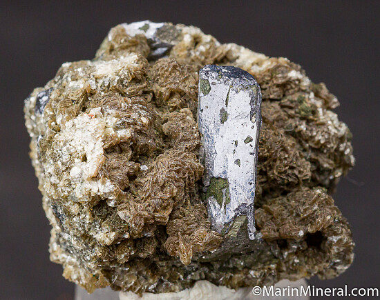 Sharp single Arseonopyrite crystal with an out coating of Galena, 1.7cm, on a mound of Muscovite. Ex. Chuck Trantham collection and comes with an old Al McGuinness label.