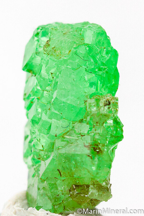 Unusual stacked cluster of gem quality Tsavorite crystals. Tsavorite is a green Grossular colored by chrome and vanadium. These faden style growths are uncommon in garnets and came out over the past several years. Complete all around.