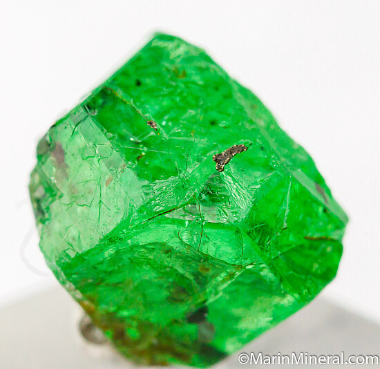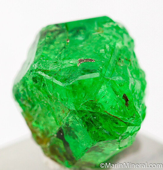 Complete and undamaged gem quality Tsavorite crystal. Tsavorite is a green Grossular colored by chrome and vanadium. A glassy transparent crystal with good faces all around with some indentations on the bottom where it intergrew with Graphite crystals. This is a good one!