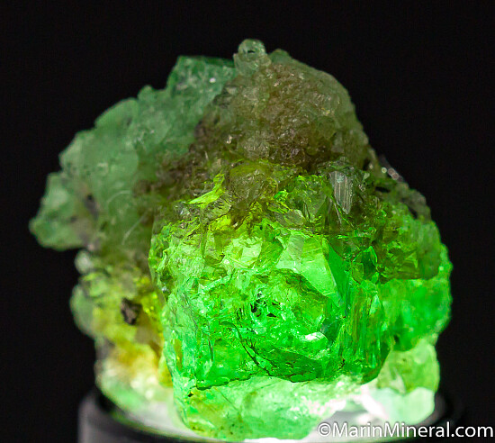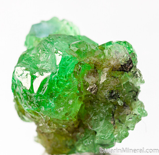 Cluster of gem quality Tsavorite crystals without matrix. Tsavorite is a green Grossular colored by chrome and vanadium. The cluster is composed of a 1cm crystal with smaller attached crystals. There is also a small blue Apatite crystal attached.