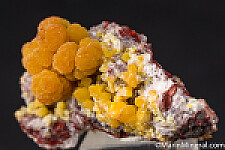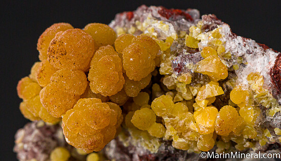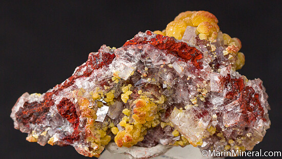 Satiny botryoidal yellow Mimetite and rhombic transparent Calcite crystals on both sides of a limonite matrix. The main Mimetite cluster on the front side is really nice with big masses of choice Mimetite. Mined in 2020 in Santa Eulalia.