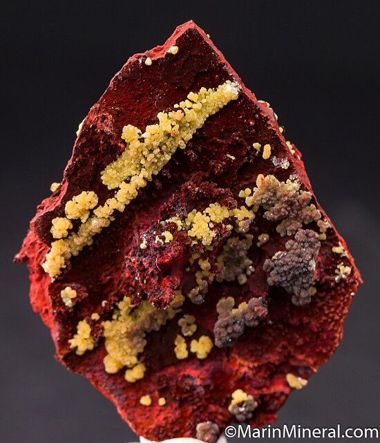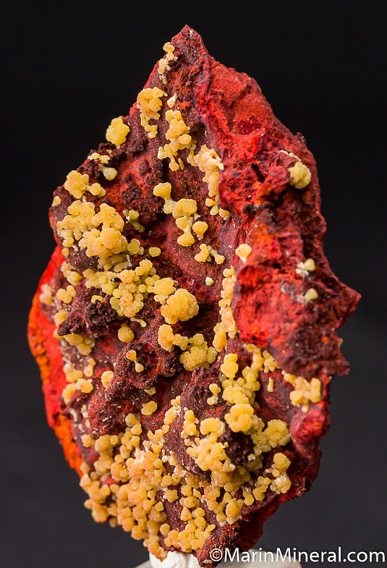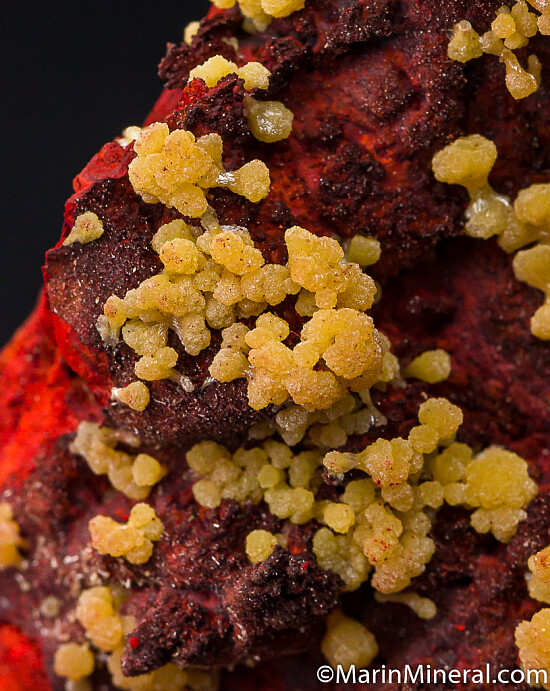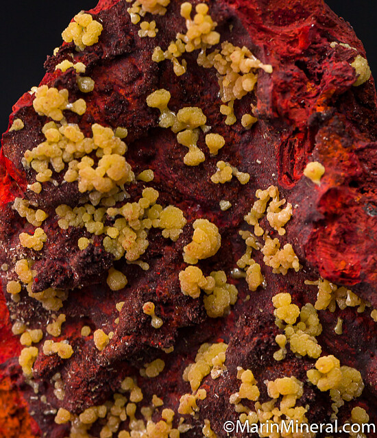 Yellow Mimetite clusters on both sides of a limonite matrix. Nice isolated Mimetite groups, some of which forn neat bow-tie clusters. Mimetite is presetn on both sides of specimen.
