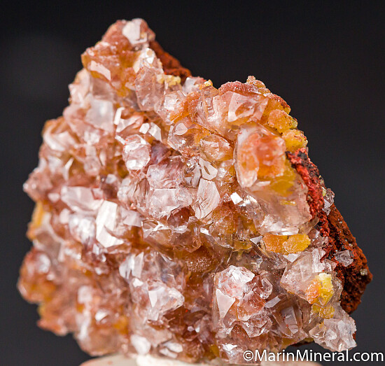 Classic Mexican combo of yellow Mimetite balls covered by trnasparent Calcite crystals, all atop a thin Limonite matrix. Beautiful glistening undamaged crystals covering the entire surface. Mined in 2020.
