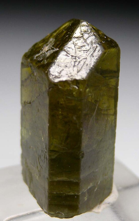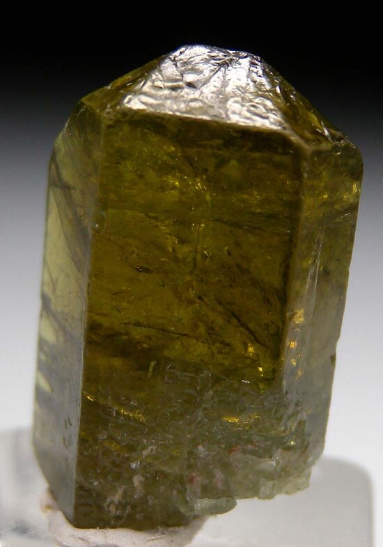 Single golden green Apatite crystal from Mwajanga. This locality is best known for it's Dravite, but sometimes turns up other species. Complete all around and transparent, this is a fine gem Apatite.