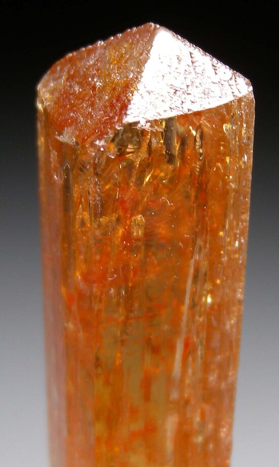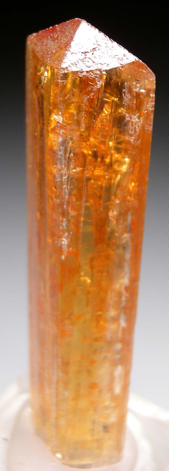 Tall single 'Imperial' Topaz crystal from Brazil. Complete all around,, well terminated, with beautiful rich coloration. Very minor edge wear, essentially undamaged. Ex. Paul Geffner collection. Weighs 15.82 grams.