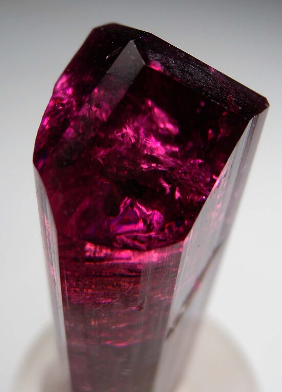 Gemmy pink Tourmaline crystal from Russia. Good transparency with a pink body color that grades to an intense pink termination. Super color and transparency at the tip. Complete all around. Ex. Paul Geffner collection. Weighs 29.63 grams.