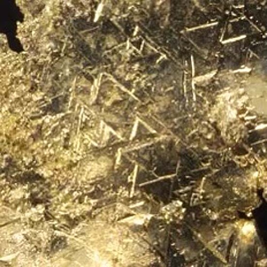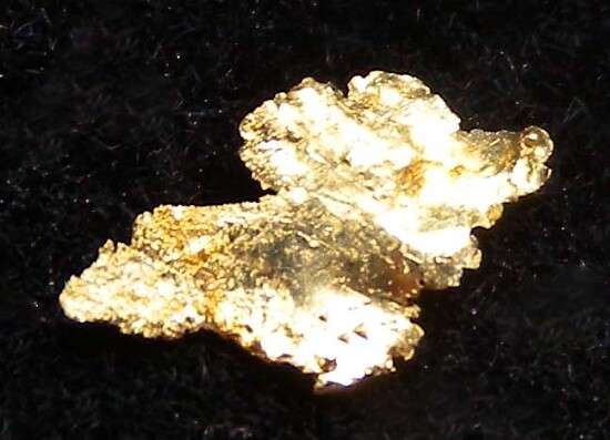 Specimen of solid Gold, known as 'leaf Gold' from the EAgle's Nest Mine in California's Mother Lode. Small, slightly undulating sheet of solid Gold that can be displayed equally well from either side. On the surface, under magnification you can trigon crystal forms. Weighs 0.06 grams.