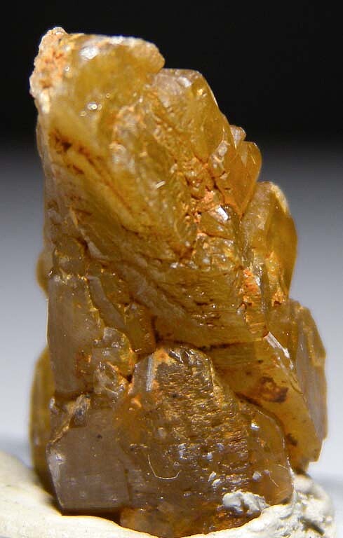 Curving cluster of reddish orange Xenotime crystals in an almost gwindel-like formation. Translucent and complete all around. Ex. Trinity Minerals with label indicating it was from the 2003 Tucson show.