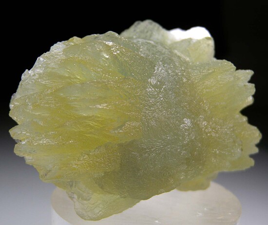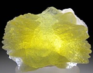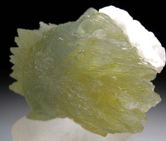 Translucent green and yellow Prehnite from the Merelani Tanzanite mines. The center is composed of a green hemisphere of Prehnite out from which grow toothy yellow crystals. Has a bit of white Calcite attached to one side.