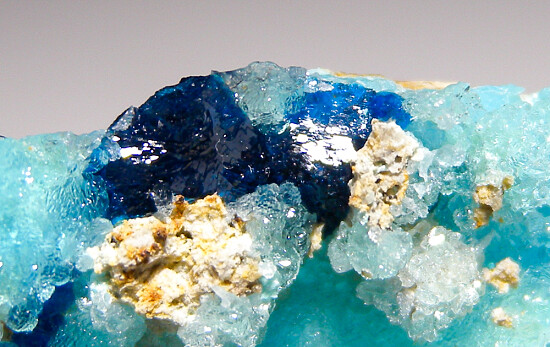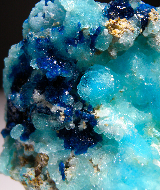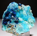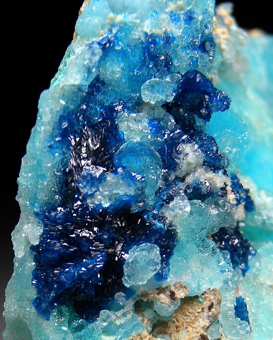 Deep blue crystals of Veszelyite on sky blue Hemimorphite. The Veszelyite form large, sparkling crystal groups in areas and the Hemimorphite is highly translucent. Mined in 2022. The locality is a former Limestone quarry with Lead, Zinc, and Copper mineralization that closed in 2018.
