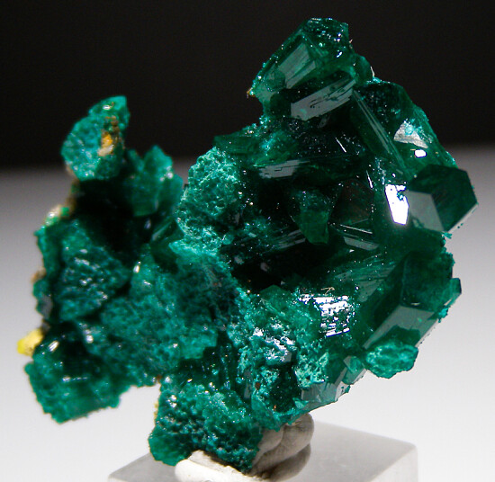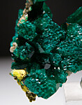 Interesting and attractive Dioptase specimen that formed between the rounded surfaces of another mineral creating this sculptural specimen. Some areas have rougher, rounded surfaces, others are areas of large Dioptase crystals with excellent high surface luster. Minor amounts of attached Mimetite and Duftite add color. Neat specimen from recent finds.