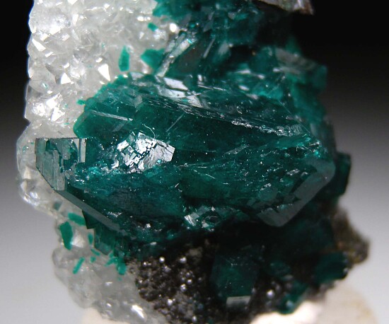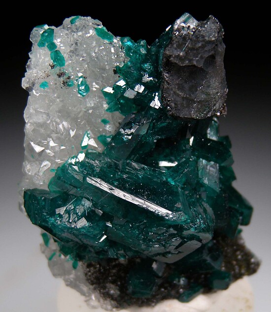 Tall, flat formation of Quartz crystals with attached Dioptase. The Quartz formation is translucent and covered on both sides by drusy crystals. The Dioptase reach large size with crystals to 2cm.