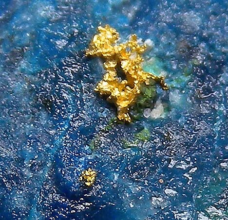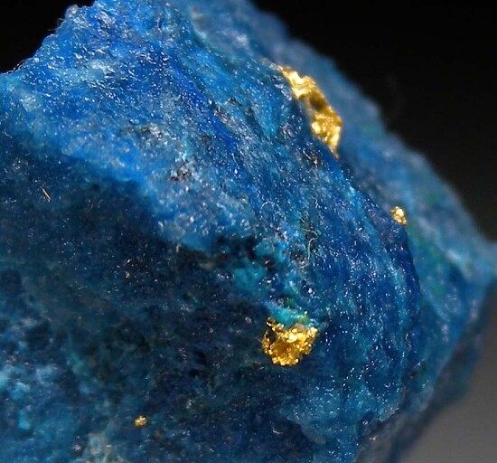 Gold in deep blue, dense Shattuckite. The largest area of Gold is 4mm wide.