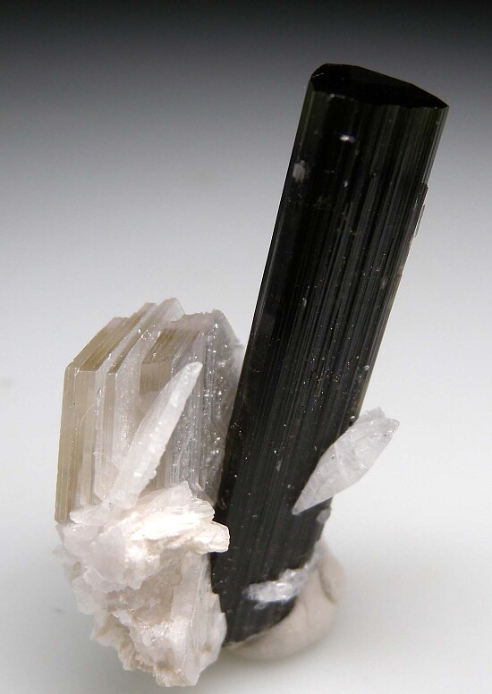 Well terminated Tourmaline crystal with attached Albite and Muscovite. The Tourmaline has a transparent green termination. A large 2.5cm book of silvery Muscovite adds contrast and beauty.
