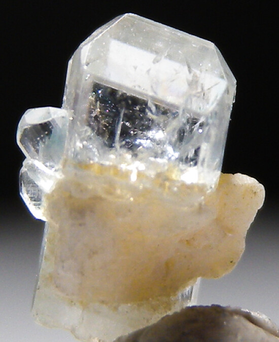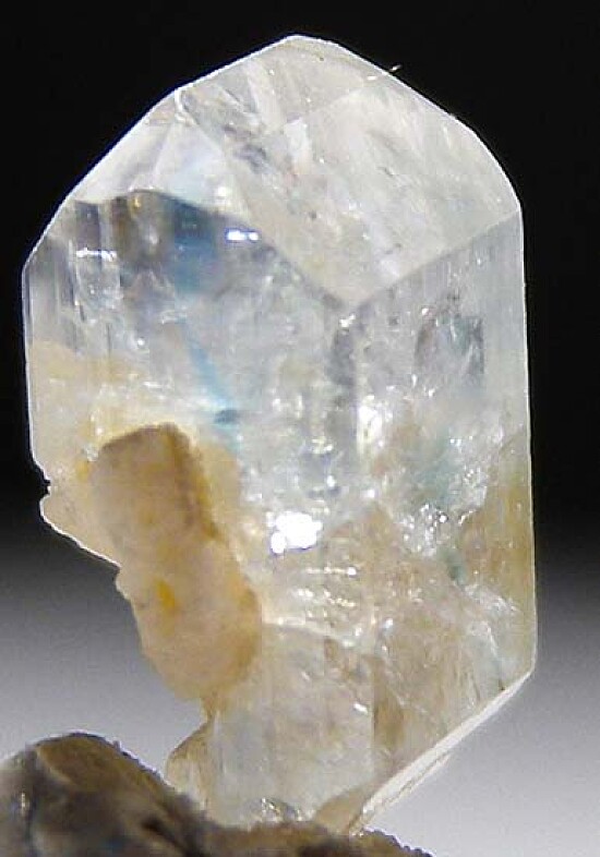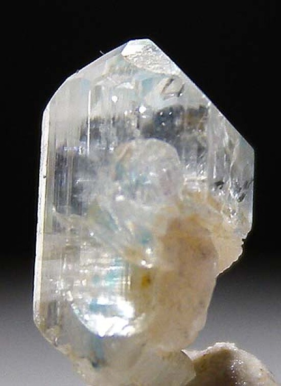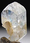 Double-terminated crystal of rare Euclase from Brazil. Translucent to transparent with white and blue coloration. This is a small but fine crystal that grew attached to Feldspart. Bright and glassy and complete. Old Brazilian classics now hard to find.