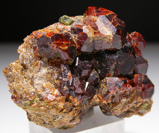 Red Andradite and green Epidote on matrix. This is a choice miniature for the locality with crystals to 1.4cm in size. Good crystals on front and back too. Collected by John Sulzbach in 2001 and comes with his collection label.