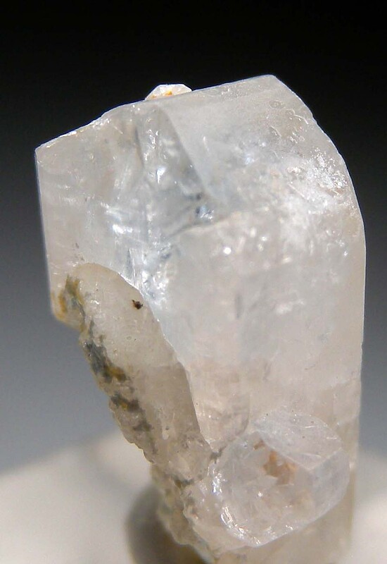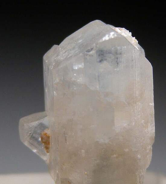 Doubly terminated single Euclase crystal with a smaller crystal sticking out the side. Translucent to transparent and undamaged with a faint blue stripe.