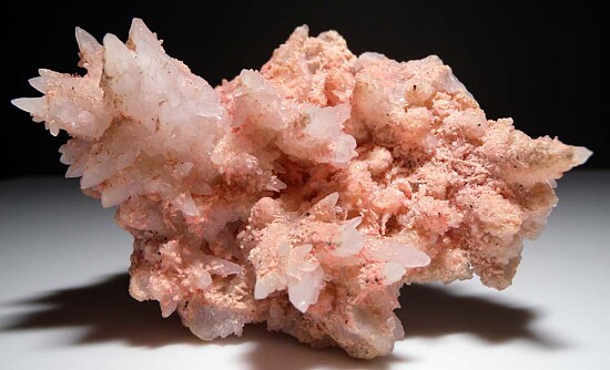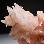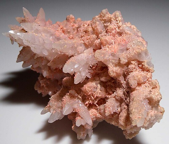 White Quartz crystals coated by pink Rhodochrosite. The Quartz form a nice variety of sizes and many of the larger crystals have smaller crystals growing out from the sides. Ex. Randy Parnagian collection.
