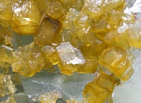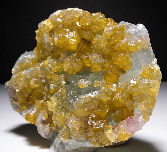 Golden Barite crystals atop translucent green cubes of Fluorite. Colorful Chinese classic. Ex. Randy Parnagian collection.
