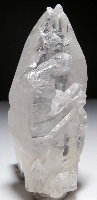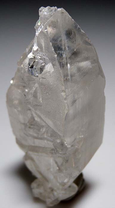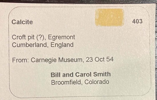 Transparent twinned Calcite crystal from England with an unusual canoe-shaped form. Well crystallized all around and in near pristine condition. Ex. Tim Sherburn, Bill and Carol Smith collections, acquired from the Carnegie Museum in 1954.