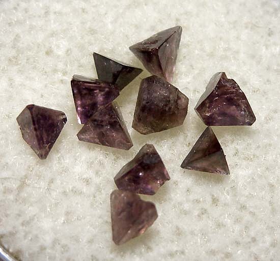 Lot of 10 tetrahedrons of Chambersite, a rare mineral found in salt formations in a small number of localities worldwide. Translucent 'Amethyst' purple in color and collected by Fred Pough in 1970. Ex. Chuck Trantham collection.