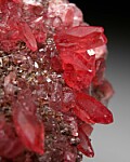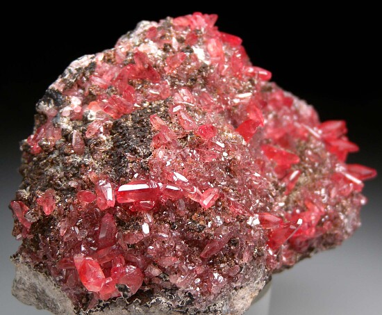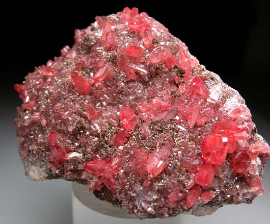 Numerous red Rhodochrosite crystals to 1.0 cm in size covering the front display face. The Rhodochrosite form transparent scalenohedral crystals and are in excellent condition. Ex. Randy Parnagian collection.