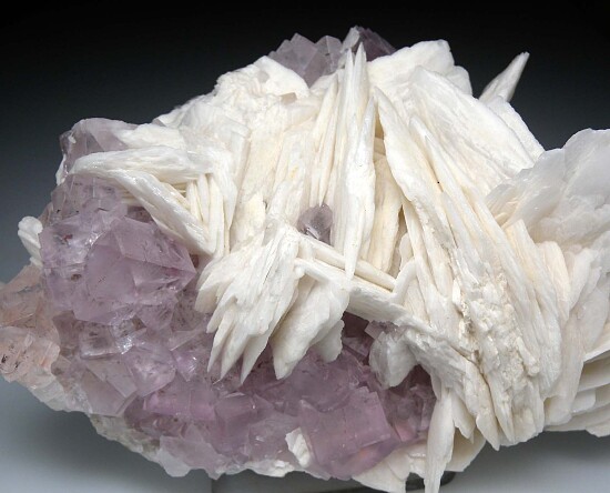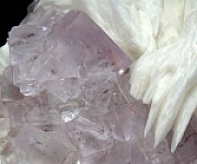 Classic old Spanish combo of pink Fluorite and Barite from Berbes. The Fluorite form transparent cubes to 2cm that contrast well against the stark white Barite. Ex. Randy Parnagian collection.